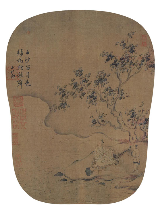 《月色秋声》,绢本,25×26.4cm,现藏于辽宁省博物馆。本画无款,旧题签“马和之月色秋声”。马和之,南宋画家,生卒年不详,钱塘(今浙江杭州)人。南宋高宗绍兴(1131-1162)年间入朝为官。以人物、山水著称于世,其画师法吴道子,有“小吴生”之誉。他在兰叶描的基础上发展出了蚂蝗描。所谓“蚂蝗描”因线形状如蚂蝗,两头尖中间粗,故此得名。此画意境疏朗萧散,以林间高士为描绘主题。图中高士于树下临流而坐,远望静思,一名侍童侧立身旁。在画面的左上方有元代书画大家赵孟頫所题的李白《题宛溪馆》中的“白沙留月色,绿树助秋声”,这两句诗恰当地点出了画中所绘的时节。图中坡岸远景的淡墨晕染与河水的略以勾勒的黑白对比形成了月夜水明的幽远景象,树叶寥落以及人物着衣表明所画为秋季,故名《月色秋声图》。