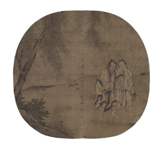 《柳荫醉归图》,绢本,23×24.8cm,现藏于北京故宫博物院。本画无款。图中所绘人物袒胸赤足,衣衫稍整者手提纸笔,二人醉扶而归,颇似魏晋名士之貌。此图画法极为纯熟,衣纹笔法顿挫有力,起讫分明,如写楷书,这与李嵩《骷髅幻戏图》中画法相近。此画法虽可归为钉头鼠尾描,但稍有不同的是其收笔处亦为顿笔非“鼠尾”状的尖笔,这样画的好处在于用笔时气势连贯,又能兼顾造型的准确性。画中柳叶的画法如同重影一般,有序的排列用笔使柳叶有了随风飘荡的动态效果。此画略显不足的是,柳树的主干挺直且位置过于偏狭。虽然如此,若仅以人物论此画仍可称宋人佳作。