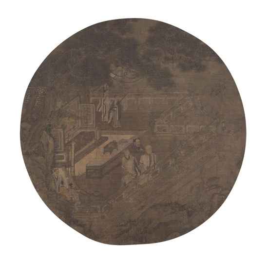 《瑶台献寿图》,绢本,32×31cm,现藏于美国大都会艺术博物馆。《瑶台献寿图》画上无名款,因其画风技法与刘松年相仿,故旧题刘松年作。刘松年(约1155-1218),南宋宫廷画家,历经孝宗、光宗、宁宗三朝。钱塘(今浙江杭州)人,因居钱塘清波门,故有刘清波之号。善画山水、人物、亭台屋宇。山水画法师自李唐更出新意,一变李唐的“斧劈皴”为“刮铁皴”,所画人物笔墨精妙,造型严谨,着色清丽典雅。多以工整的界画作亭台阁榭,因多画园林小景,后人称其为“小景山水”。刘松年与李唐、马远、夏圭并称“南宋四大家”。此画描绘的是众仙瑶台献寿的景象。三位献寿的仙君居于画面中央作揖遥拜,四周围栏陈设工整繁复用界画方式表现。画中人物神态各异全凭不同形状的点睛之笔,衣褶勾勒以“兰叶描”为之,树石画法属“刮铁皴”之类。全画设色古雅,以淡墨细染物象之阴阳,后略施淡彩,唯有须眉衣襟处渲染重墨。细看画中案几坐具,方寸之间花纹图案纤毫毕现,整体而观又无琐屑之弊,是宋代小品画中的佳构。